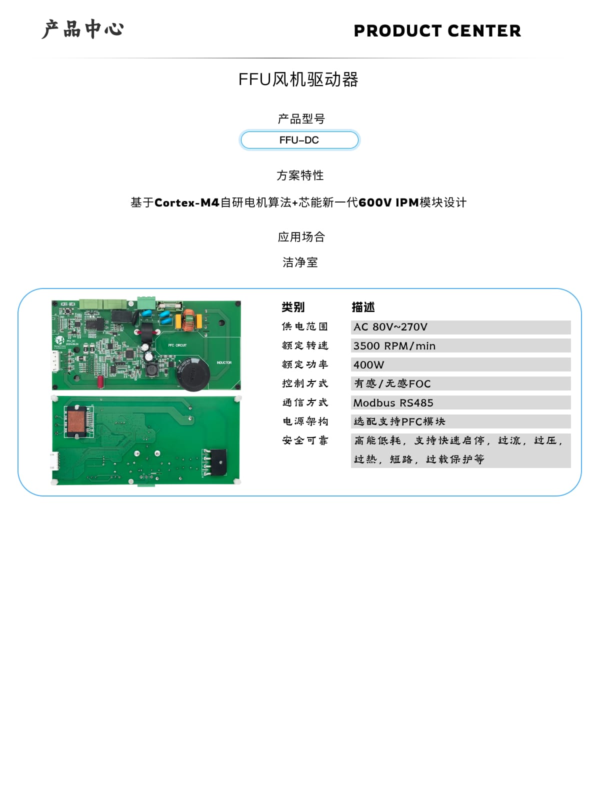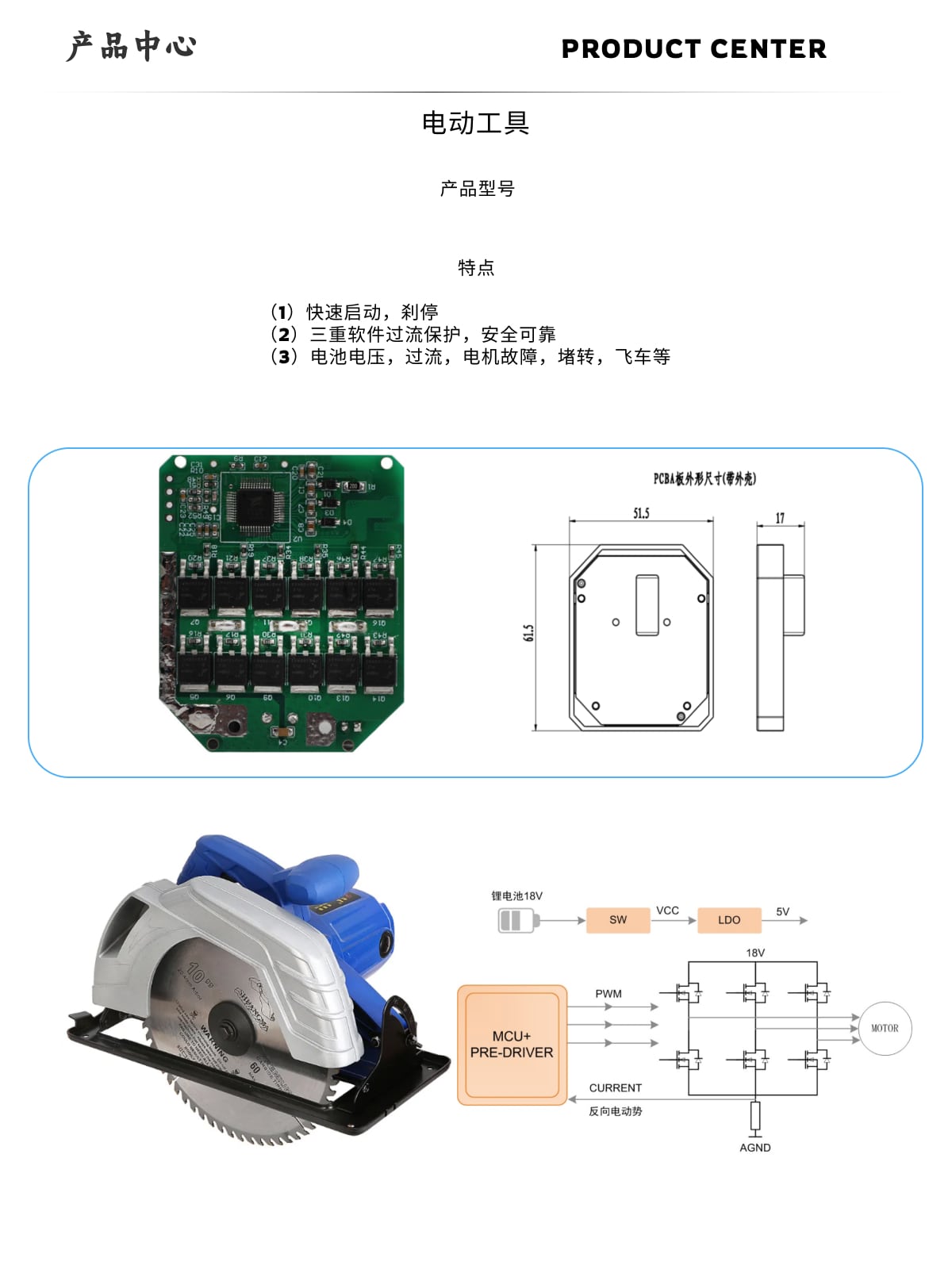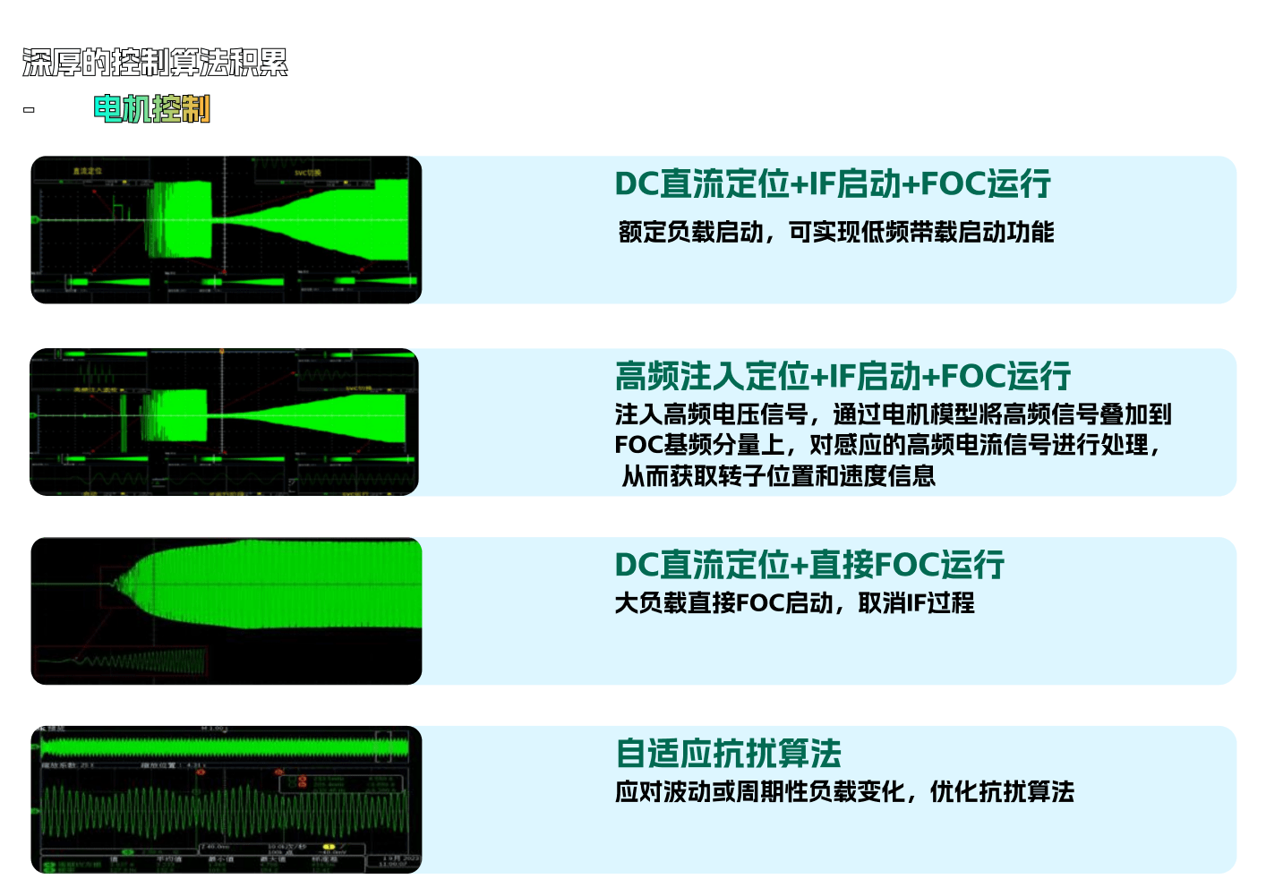 我们拥有强大的实时控制芯片MCU电 机控制算法,可根据行业以及客户的需 求定制其专属芯片方案,在成本、功耗 以及性能上完美匹配,从而极大提升产 品方案竞争力。