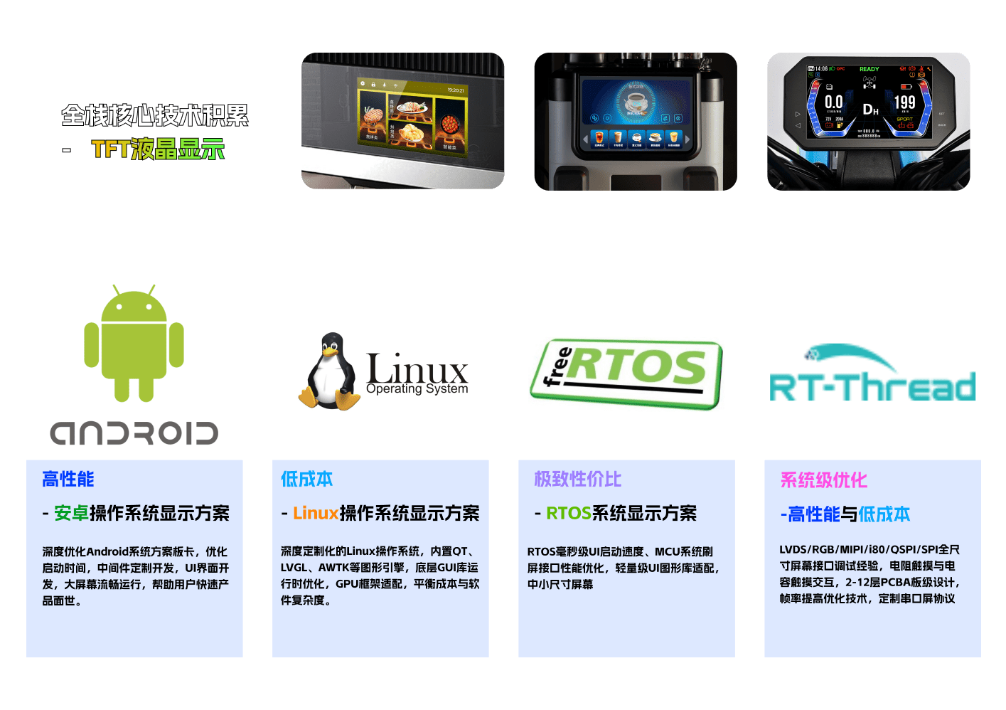 标准硬件产品。为行业客户提供标准硬件形态的TFT彩屏模组、串口屏、Linux和安卓显示一体机、旋钮显示屏模组等。为客户适配系统软件中间件、逻辑业务开发与UI显示界面开发设计服务。